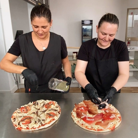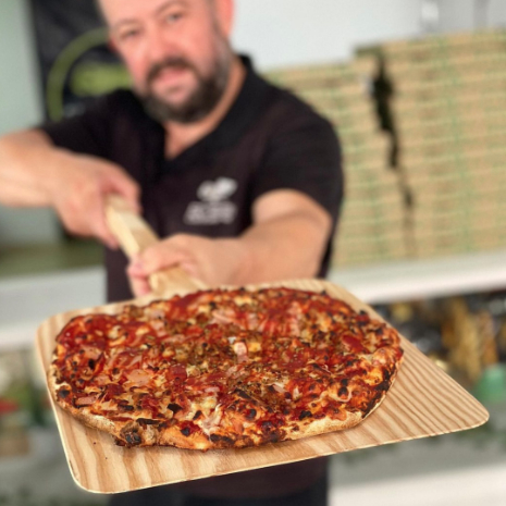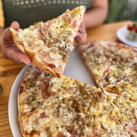 Tomato sauce, Mozarella, York Ham, Corn, Chorizo and Oregano.