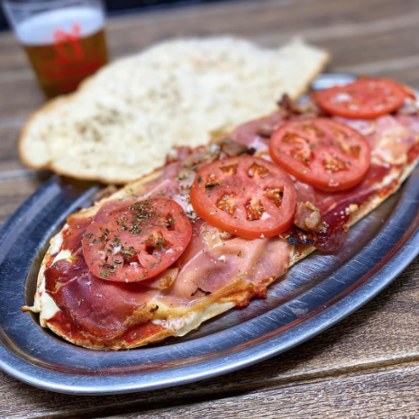 Mozzarella, Oregano, Tomato Sauce, Serrano Ham, Bacon and Tomato.