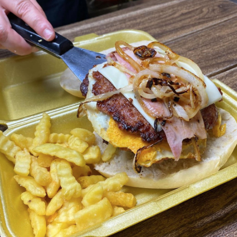 2 Burgers, Tomato, Cheese, Lettuce, Onion, Egg and Bacon.
