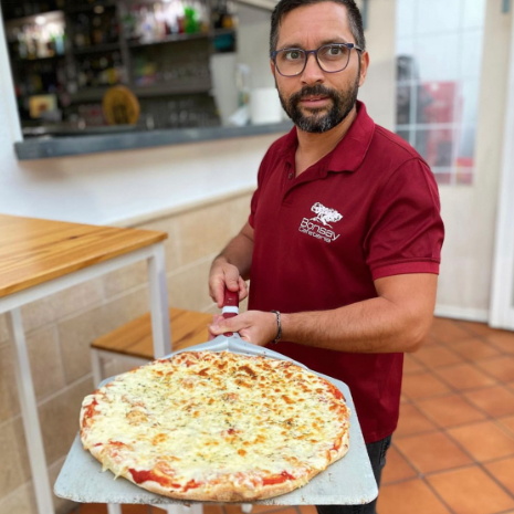 Tomato sauce, Mozarella, Chorizo, onion and Oregano.
